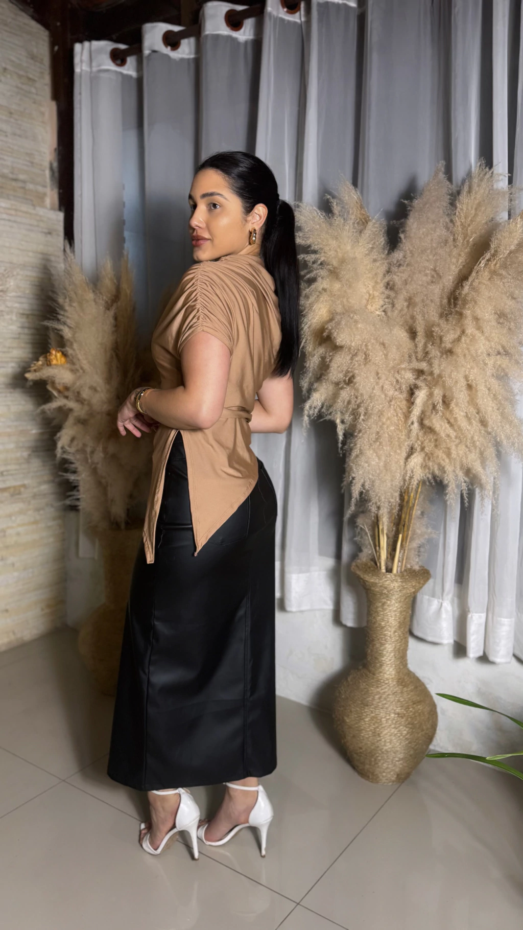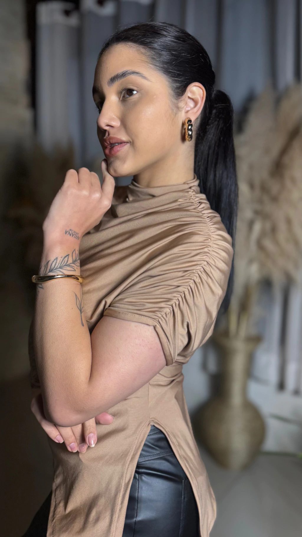 Detalhes: modelagem ajustada, tecido em poliamida, detalhe em manga drapeada e recorte assimétrico lateral, caimento elegante.