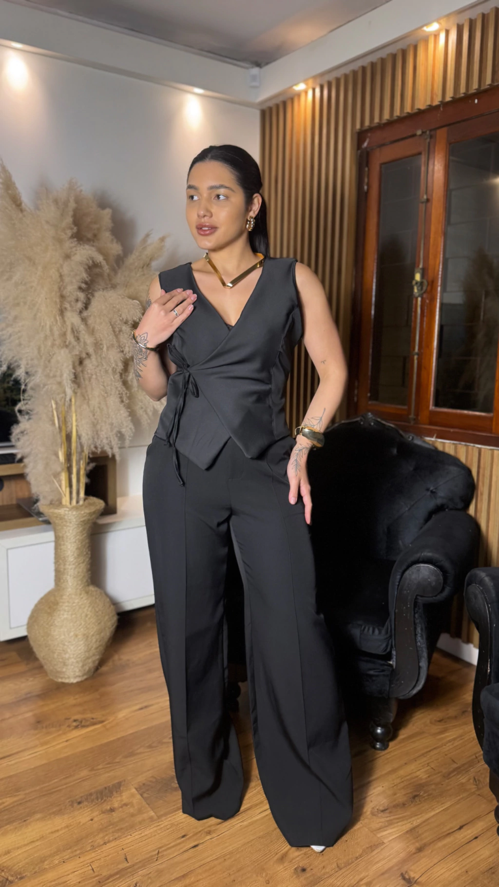 Detalhes: modelagem ajustada, tecido encorpado em alfaiataria, cinto em amarração, caimento elegante.