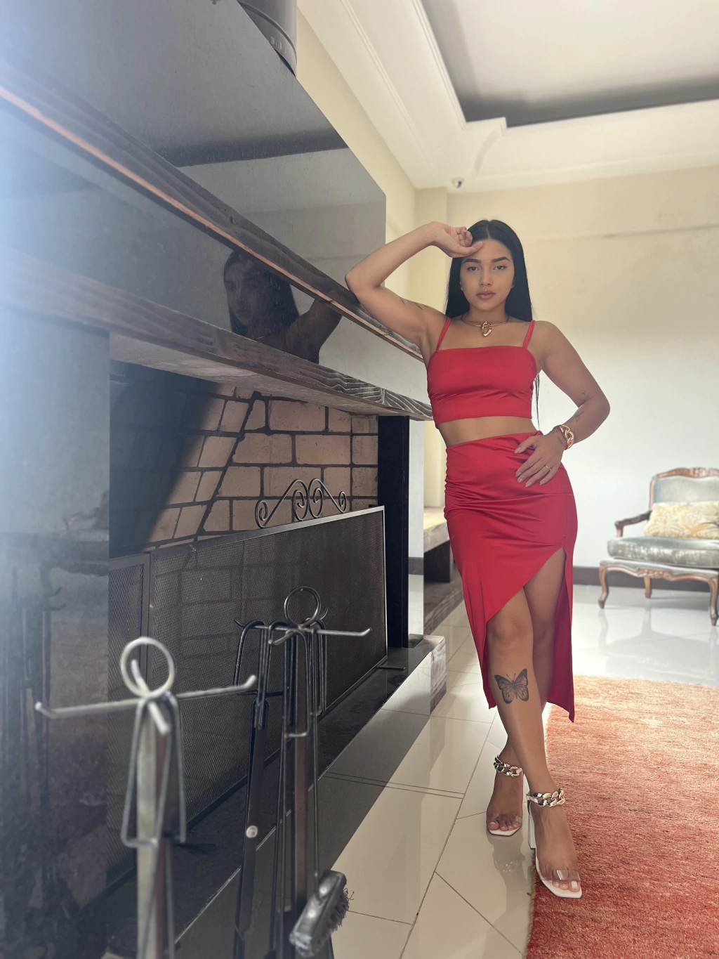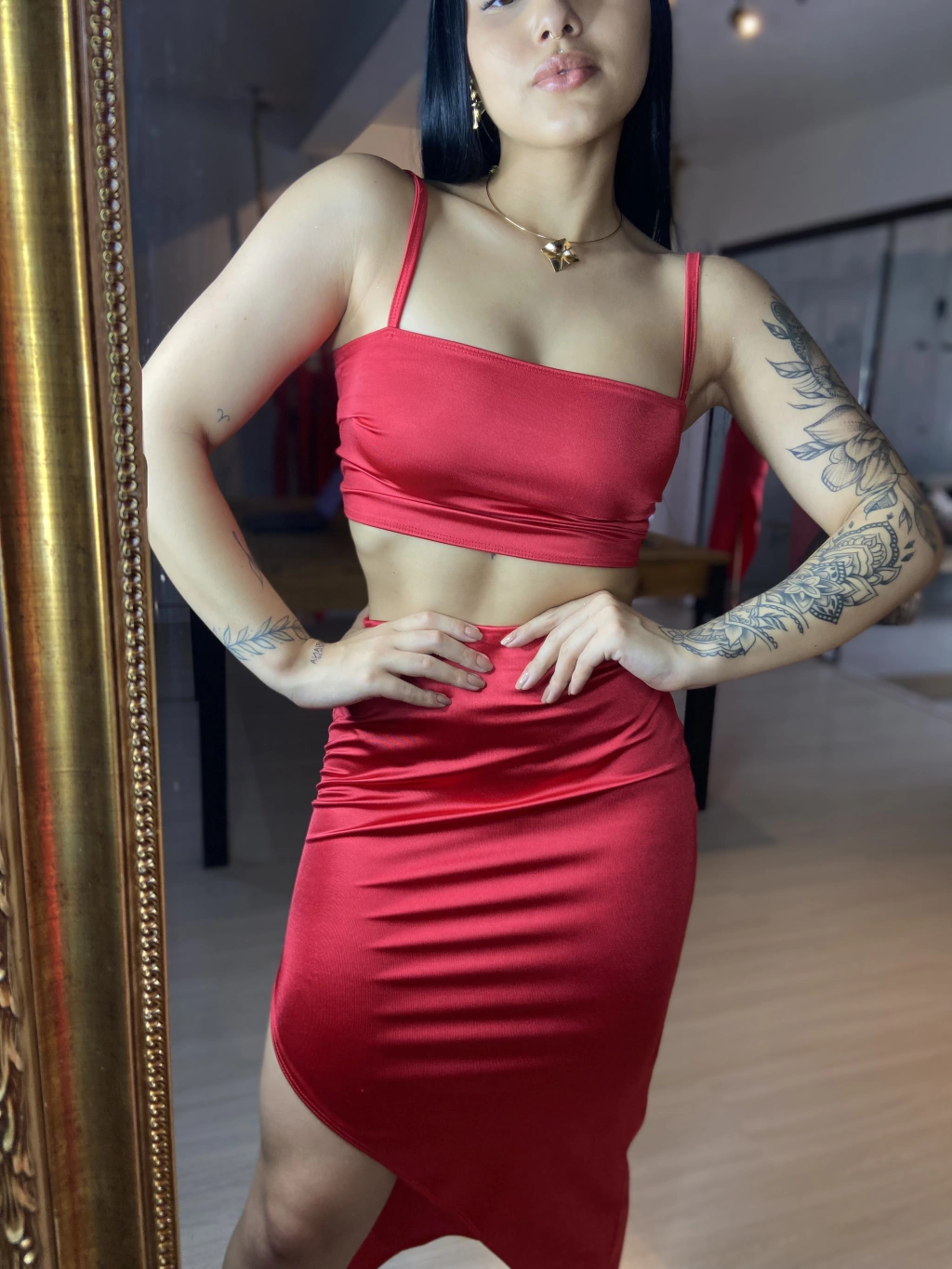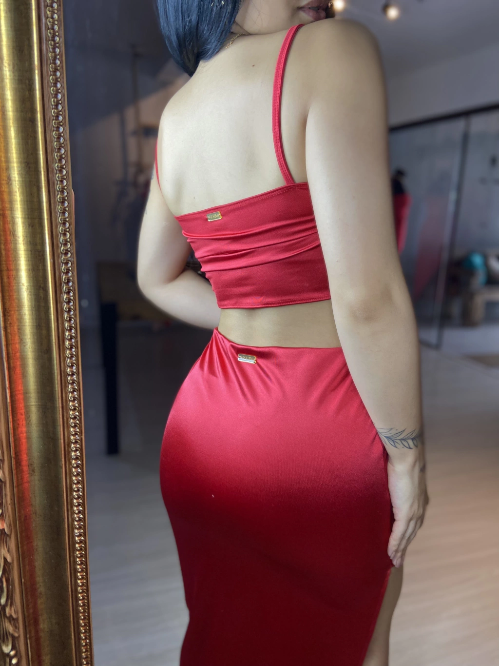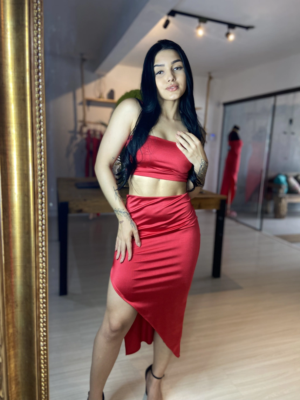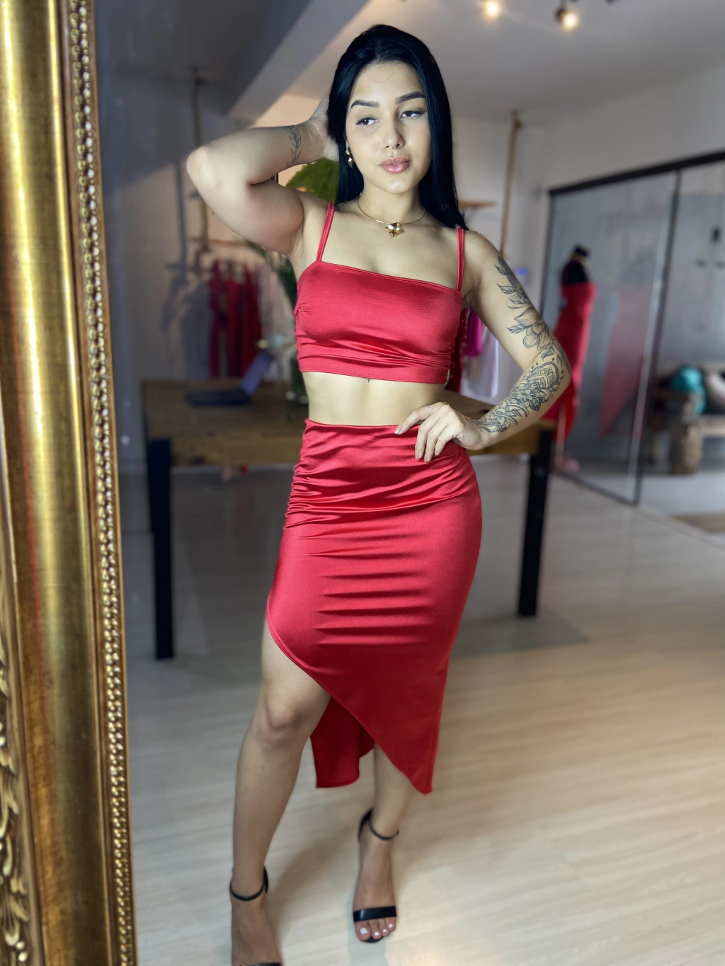 Transmita poder com o Conjunto Bianca em vermelho. Com design exclusivo e elástico na cintura, este conjunto em tecido amni é uma escolha autêntica e elegante para quem busca impacto visual e conforto.