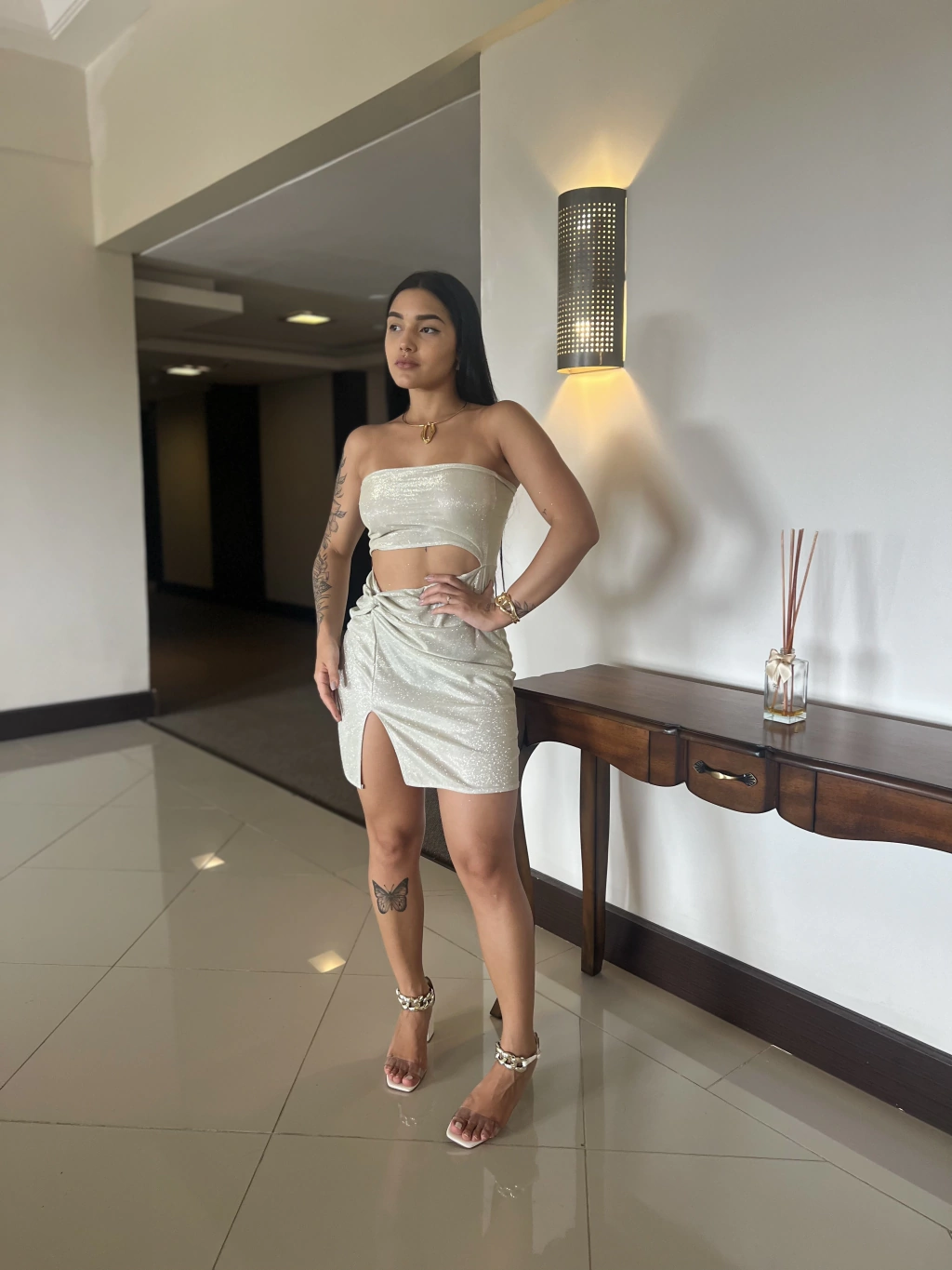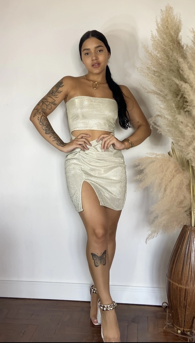 Confeccionado em lurex premium, este vestido longo brilhoso destaca-se pela racha frontal e pelos brilhos exuberantes. Uma peça sofisticada, que foi sucesso no aniversário de 2 anos da marca Ariana e agora está disponível em confecção própria para você brilhar ainda mais.